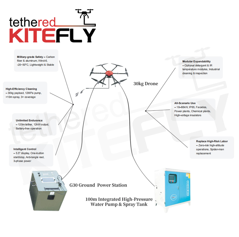 Pil ile çalışan dronlar genellikle20~40 dakika. Uçuş süresinin azalması, büyük ölçekli cephe temizleme projeleri için uygun olmamalarını sağlar.Bağlı drone temizlik sistemimiz. Yüksek katlı binalar için uzun süreli ve istikrarlı çalışmayı sağlayan yerden sürekli güç kaynağı sağlar.16kW çıkış gücü ve120 metrelik ip uzunluğu, sistem tutarlılık, güvenlik ve çalışma süresi önemli olan endüstriyel temizlik görevleri için tasarlanmıştır. Lianyungang Tahıl Depoları ve Endüstriyel Cephe Projeleri'nde kanıtlanmıştır.. |